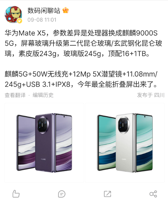 博主@数码闲聊站 表示,华为 Mate X5 将换芯麒麟 9000S,屏幕升级第二代昆仑玻璃 / 玄武钢化昆仑玻璃,素皮版 243g,玻璃版 245g。