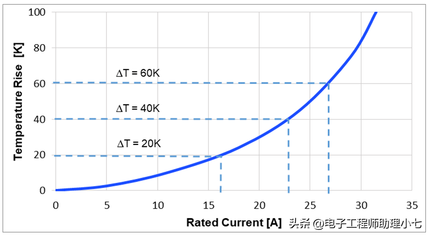 下图体现了温升与额定电流之间的关系。该曲线可用于确定任意温升对应的电流值。