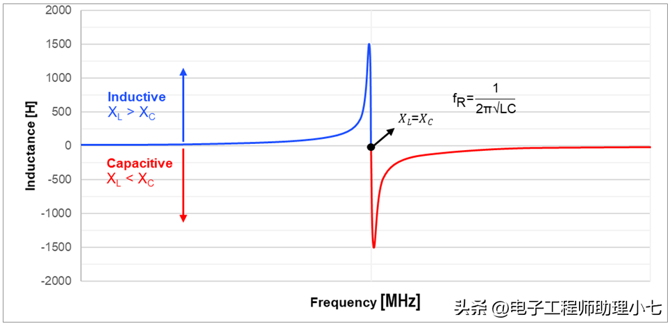 电感在谐振频率 (fR)之前具有电感特性(如图下图的蓝色曲线所示),因为频率增加,阻抗增高。在谐振频率下,负容抗 (XC) 等于正感抗 (XL),其值可通过下面公式估算: