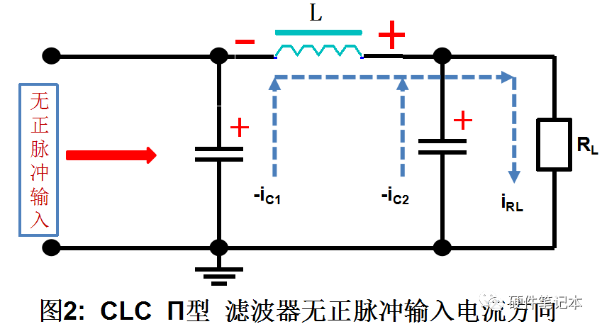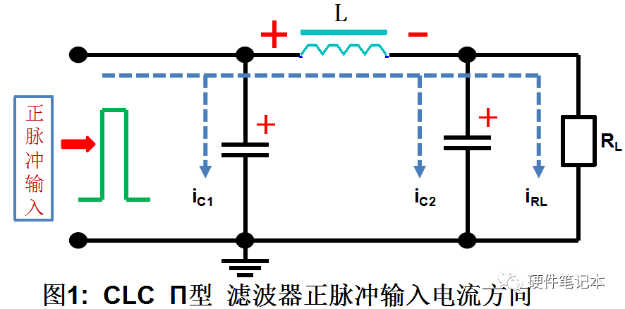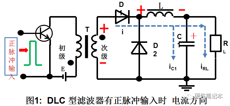 a.输入正脉冲时,先给C1充电,充电电流为ic1,迅速充到脉冲的峰值电压Vi,同时电感器L中也有线性增长的电流,并在L中储存了磁能,随着电流的增长,储存的磁能越来越多,电容器C2通过电感L也充上了电压,充电电流为ic2,C2和C1上的电压基本相等,负载RL中的电流IRL也是由输入脉冲供给。
