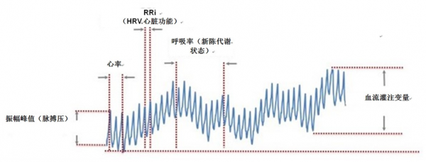 光学心率传感器可生成测量心率的PPG波形并将该心率数据作为基础生物计量值,但是利用PPG波形可以测量的对象远不止于此。图3是经过简化的PPG信号,该信号代表了多个生物计量的测量结果。