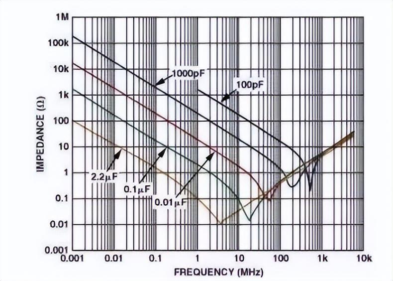 但由于引线和PCB布线原因,实际上电容是电感和电容的并联电路,(还有电容本身的电阻,有时也不可忽略)这就引入了谐振频率的概念: