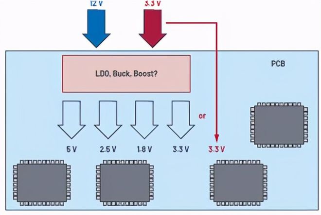 我们先来举个设计示例。图1显示将12 V和3.3 V输入电源作为主电源的电路板框图。主电源必须降压,以便针对PCB应用产生5 V、2.5 V、1.8 V,甚至3.3 V电压。如果外部3.3 V电源能够提供足够的电源和低噪声,那么可以直接使用3.3 V输入电轨,无需额外调节,以免产生额外成本。如果不能,则可以使用12 V输入电轨,通过降压至PCB应用所需的3.3 V来满足电源要求。