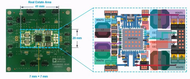 量产PCB设计通常要求使用紧凑的多轨电源,以实现高功率、高效率、出色的性能和低噪声。例如,ADP5054四通道降压稳压器为FPGA等应用提供高功率(17 A)单芯片多轨电源解决方案,如图7所示。整个电源解决方案约41 mm × 20 mm大小。ADP5054本身的大小仅为7 mm × 7 mm,可以提供17 A总电流。要在紧凑空间内实现极高的功率电平,可以考虑使用ADI公司的µModule® 稳压器,例如LTM4700,可以在15 mm × 22 mm的封装大小内提供高达100 A电流。