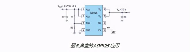 2.5 V和1.8 V CMOS的VIL分别是0.7 V和0.63 V。遗憾的是,此逻辑电平的安全裕度尚不足以避免开关噪声。要解决此问题,有两种方案可选。第一种:如果图1所示的外部3.3 V电源具备足够功率且噪声极低,则分接这个外部3.3 V电源,并使用线性稳压器(LDO稳压器),例如ADP125(图5)或ADP1740来获得2.5 V和1.8 V电源。注意,从3.3 V到1.8 V有1.5 V压降。如果此压降会导致问题,则可以使用混合方法。第二种:如果外部3.3 V电源的噪声不低,或不能提供足够功率,则分接12 V电源,通过降压稳压器后接LDO稳压器来产生3.3 V、2.5 V和1.8 V电源;混合方法如图6所示。