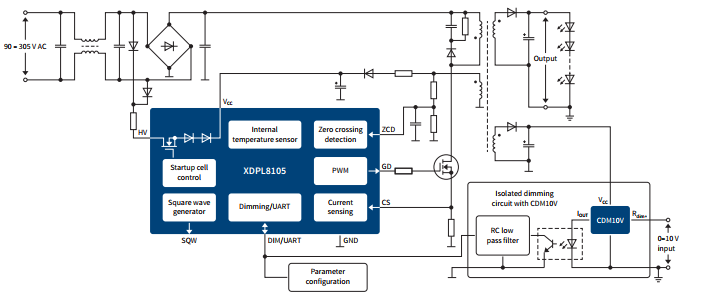 英飞凌开发的数字化控制器,以及能够让照明系统制造商根据其需求配置各参数的特殊软件,打开了进入具备众多优势的数字化照明世界的大门。采用英飞凌的数字化控制器,LED驱动电源可以在生产结束时才确定产品规格,这能为客户带来更大的灵活性,因为他们不必再花费很大代价去设计新的产品型号。借助.dp digital power 2.0,开发时间最多可缩短70%,因此,客户能显著加快将新产品推向市场的步伐。 此外,数字化还能让用户实现模拟方案无法实现的创新。 XDPL8105是一款可配置的数字化反激式(Flyback)控制器,针对10到80 W的恒功LED驱动提供功率因数校正(PFC)功能。得益于很高的集成度,以及原边控制,该控制IC只需少量的外部元件。这样能将系统成本降低达10%。该控制IC采用强大的算法,支持多种工作模式,其优势包括高效率、高功率因数校正、低THD等。这样可以形成没有闪烁的优质光源。该控制IC搭载支持0到10 V调光的输入端口,无需额外配置包括电源在内的振荡器。有源突发模式(Active Burst Mode)可以显著扩大调光范围,同时防止不良影响,如闪烁或微光等。除了更高的灵活性外,这还意味着节省物料成本。在高度分散的照明市场里成为重要的竞争优势。